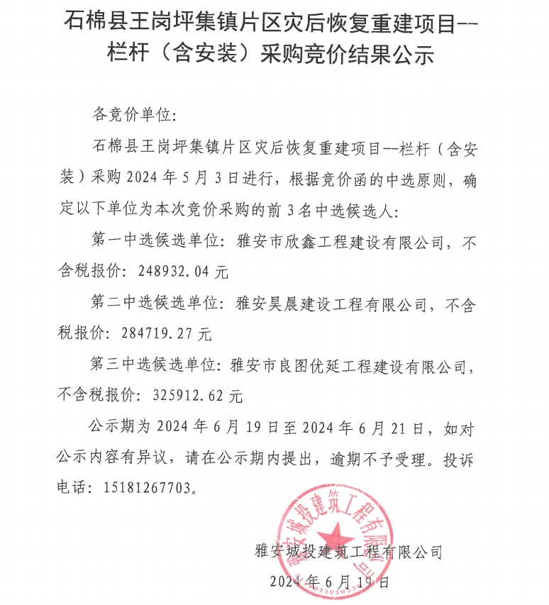 石棉縣王崗坪集鎮(zhèn)片區(qū)災(zāi)后恢復(fù)重建項目--欄桿(含安裝)采購競價結(jié)果公示