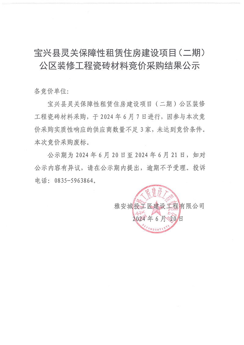 寶興縣靈關保障性租賃住房建設項目(二期)公區(qū)裝修工程瓷磚材料競價采購結果公示
