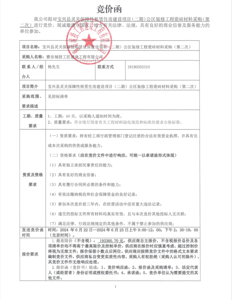 寶興縣靈關(guān)保障性租賃住房建設(shè)項目(二期)公區(qū)裝修工程瓷磚材料采購(第二次)競價公告