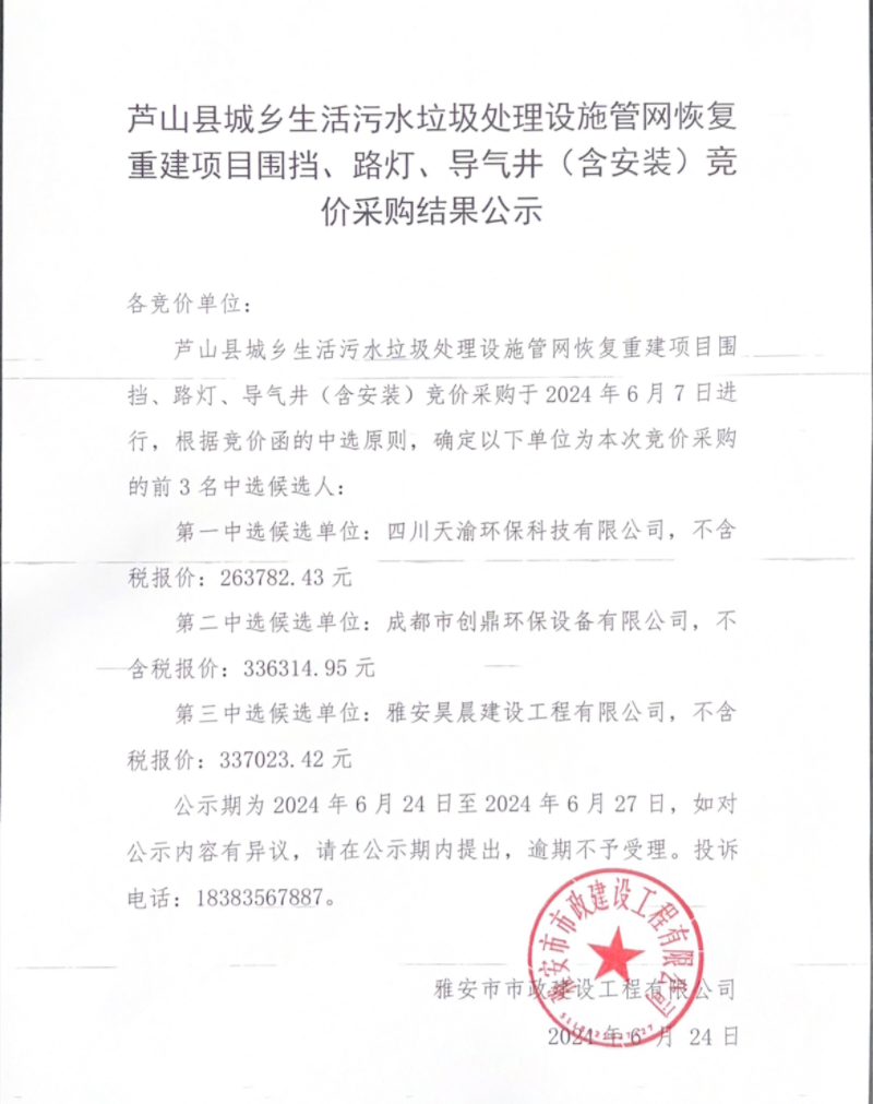 蘆山縣城鄉(xiāng)生活污水垃圾處理設施管網恢復重建項目圍擋、路燈、導氣井(含安裝)競價采購結果公示