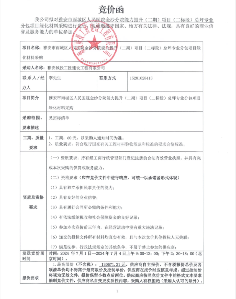 雅安市雨城區(qū)人民醫(yī)院金沙分院能力提升(二期)項(xiàng)目(二標(biāo)段)總坪專業(yè)分包項(xiàng)目綠化材料采購(gòu)競(jìng)價(jià)公告