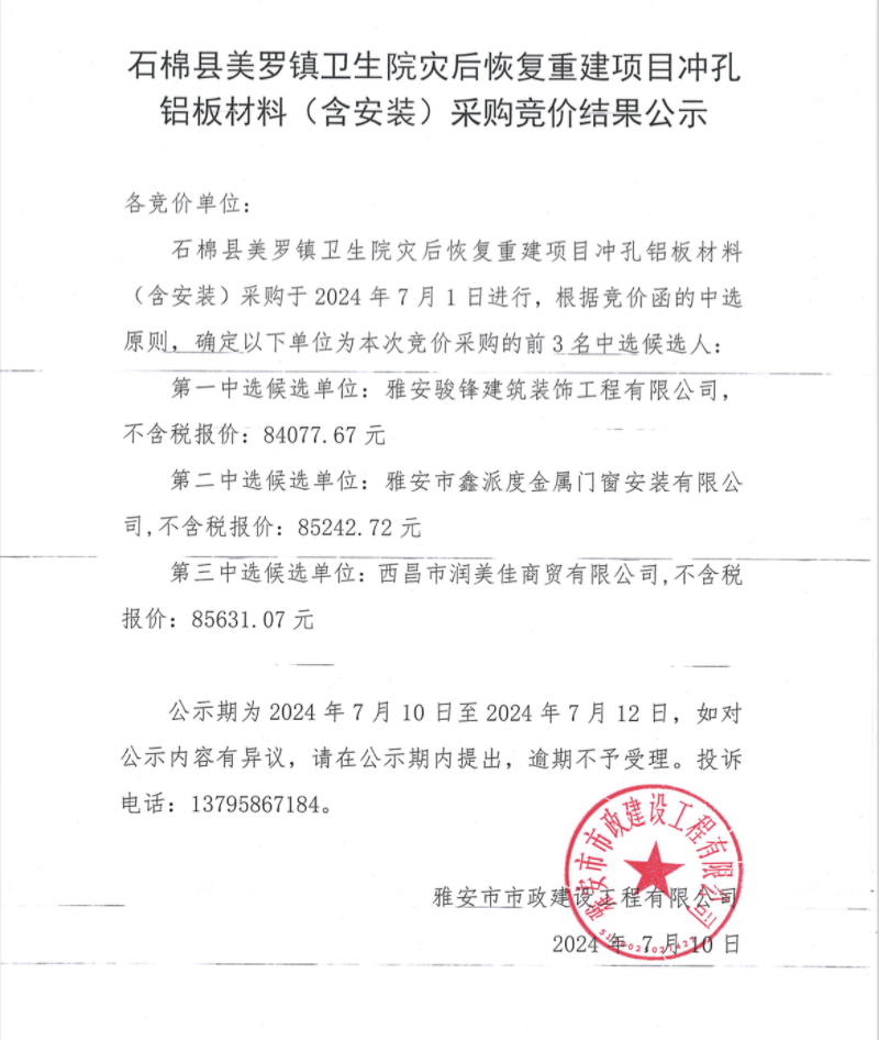 石棉美羅鎮(zhèn)衛(wèi)生院災后恢復重建項目沖孔鋁板材料(含安裝)采購競價結果公示