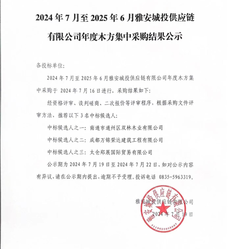 2024年7月至2025年6月雅安城投供應(yīng)鏈有限公司年度木方集中采購(gòu)結(jié)果公示