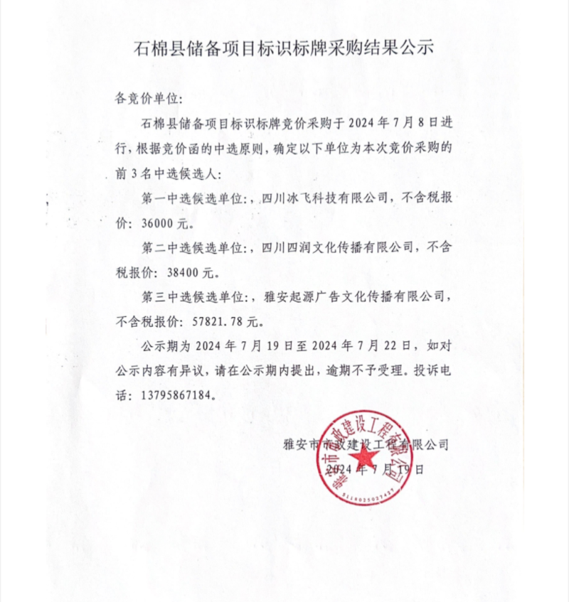 石棉縣儲備項目標識標牌采購結(jié)果公示
