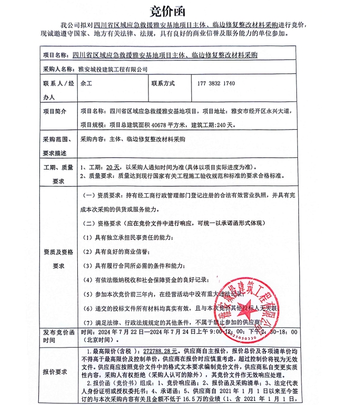 四川省區(qū)域應(yīng)急救援雅安基地項目主體、臨邊修復(fù)整改材料采購競價公告