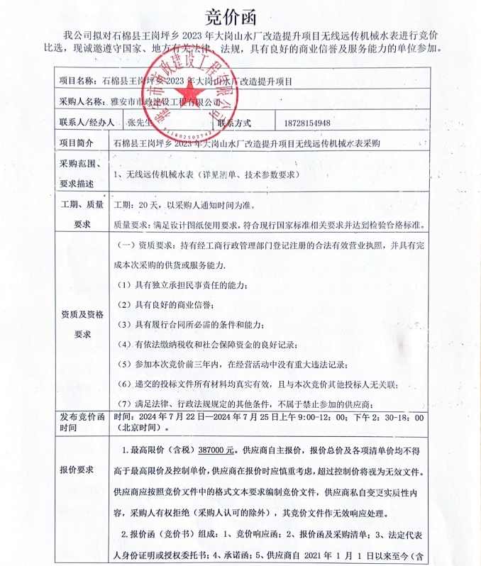 2023年大崗山水廠改造提升項(xiàng)目無線遠(yuǎn)傳機(jī)械水表競價(jià)函