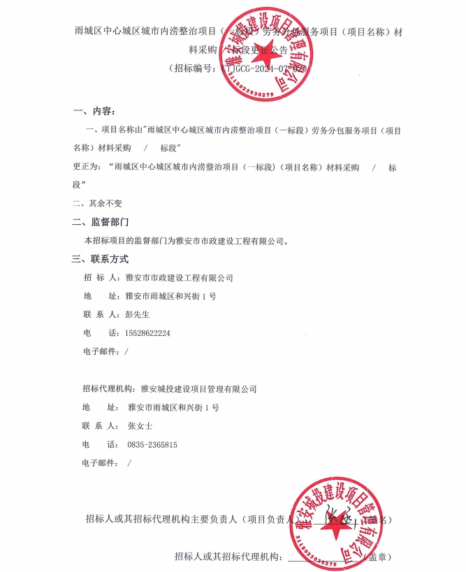 雨城區(qū)中心城區(qū)城市內(nèi)澇整治項目(一標(biāo)段)勞務(wù)分包服務(wù)項目(項目名稱)材料采購/標(biāo)段更正公告