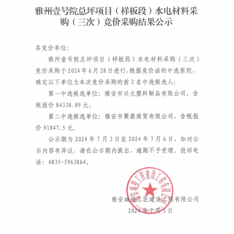 雅州壹號(hào)院總坪項(xiàng)目(樣板段)水電材料采購(三次)競(jìng)價(jià)采購結(jié)果公示