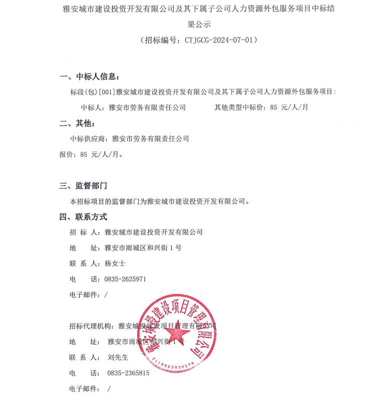 雅安城市建設(shè)投資開發(fā)有限公司及其下屬子公司人力資源外包服務(wù)項目中標(biāo)結(jié)果公示