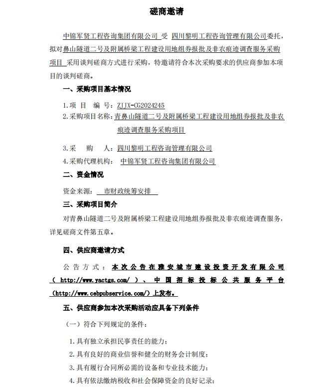 青鼻山隧道二號及附屬橋梁工程項(xiàng)目用地組劵報(bào)批及非農(nóng)痕跡調(diào)查服務(wù)采購項(xiàng)目磋商邀請公告