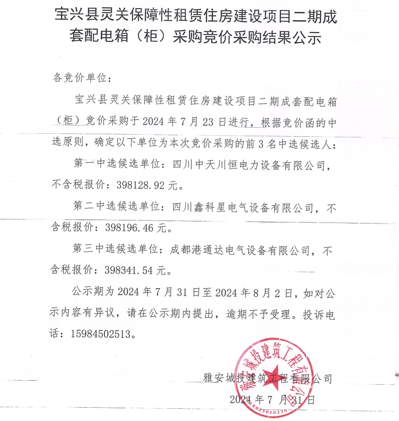 寶興縣靈關(guān)保障性租賃住房建設(shè)項(xiàng)目二期成套配電箱(柜)采購競價(jià)采購結(jié)果過公示