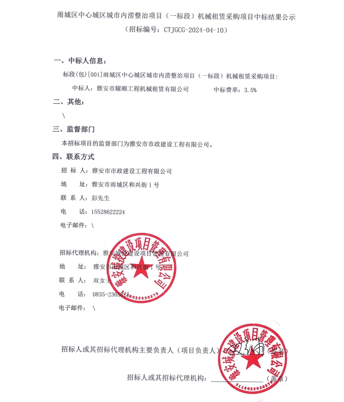 雨城區(qū)中心城區(qū)城市內(nèi)澇整治項(xiàng)目(一標(biāo)段)機(jī)械租賃采購項(xiàng)目中標(biāo)結(jié)果公示
