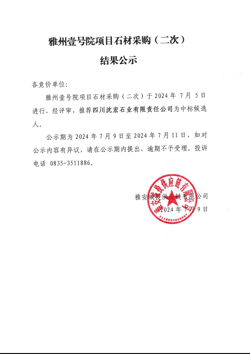 雅州壹號(hào)院項(xiàng)目石材采購(二次)結(jié)果公示