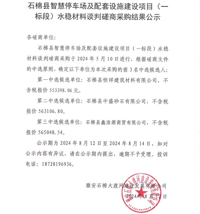石棉縣智慧停車場及配套設(shè)施建設(shè)項目(一標(biāo)段)水穩(wěn)材料采購談判磋商采購結(jié)果公示