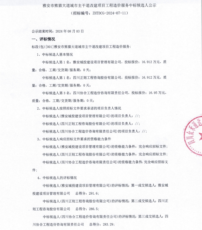 雅安市熊貓大道城市主干道改建項目工程造價服務(wù)中標(biāo)候選人公示