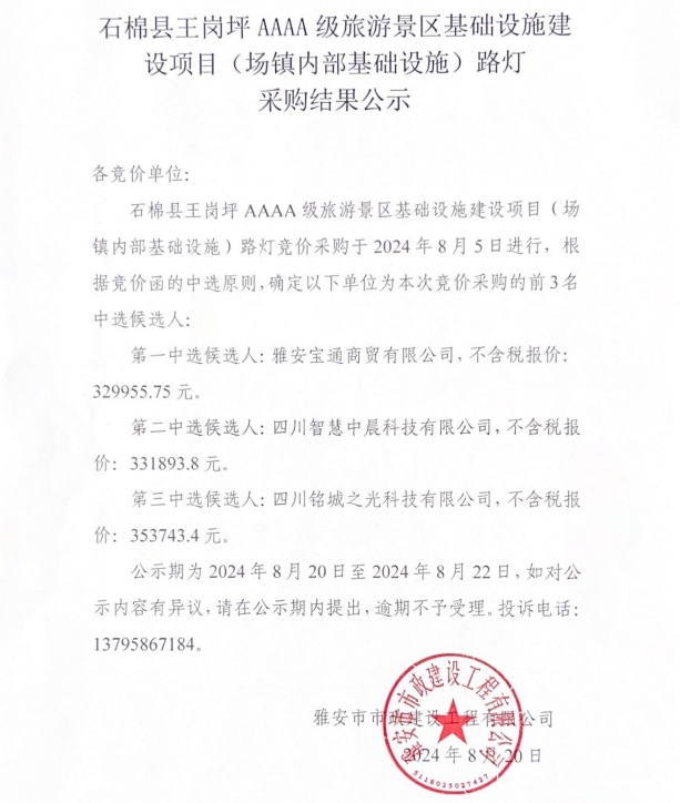 石棉縣王崗坪鄉(xiāng)AAAA級旅游景區(qū)基礎設施建設項目(場鎮(zhèn)內部基礎設施)路燈采購結果公示
