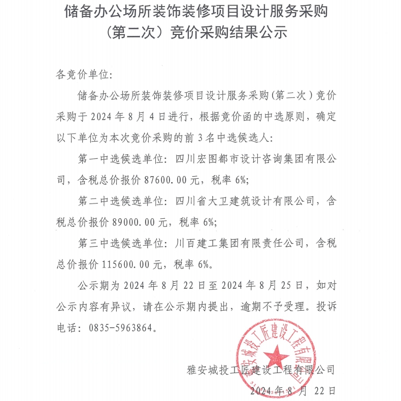 儲備辦公場所裝飾裝修項(xiàng)目設(shè)計(jì)服務(wù)采購(第二次)競價采購結(jié)果公示