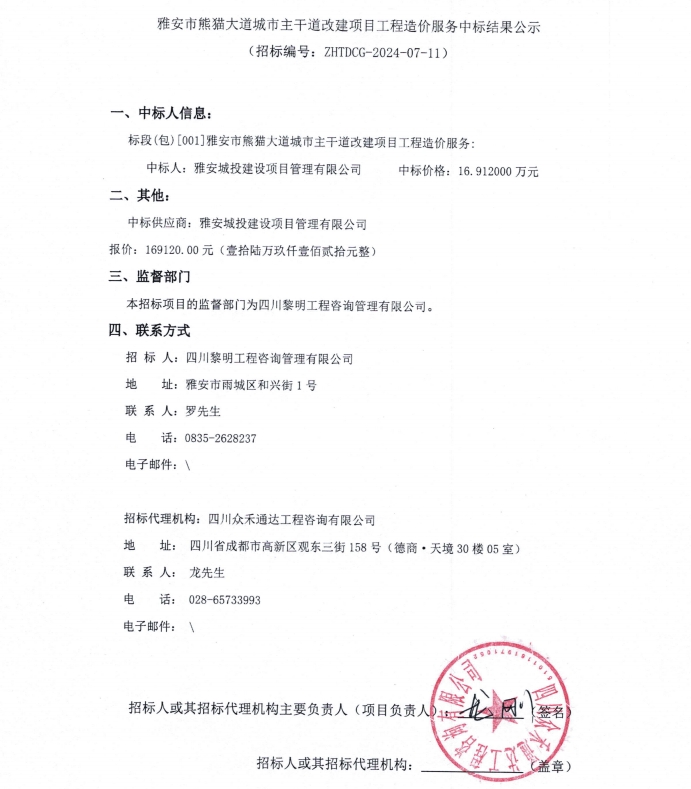 雅安市熊貓大道城市主干道改建項目工程造價服務(wù)中標結(jié)果公示