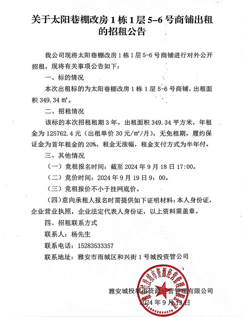 關(guān)于太陽巷棚改房1棟1層5-6號(hào)商鋪出租的招租公告