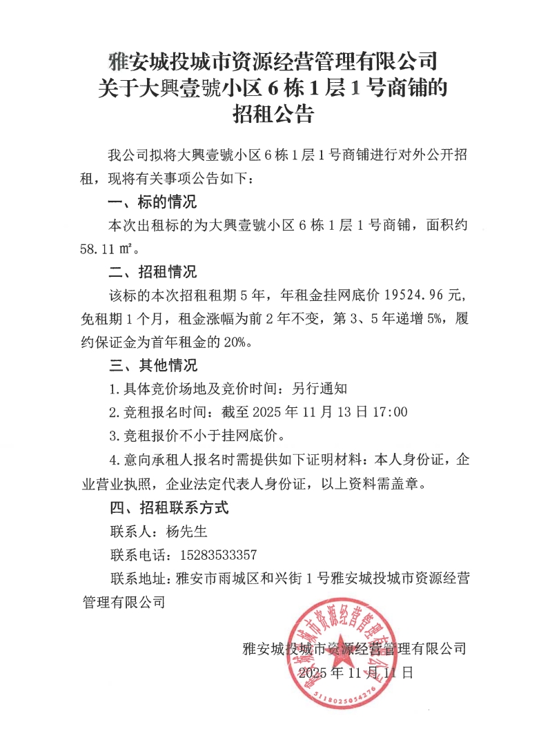 雅安城投城市資源經(jīng)營管理有限公司關(guān)于大興壹號小區(qū)6棟1層1號商鋪的招租公告