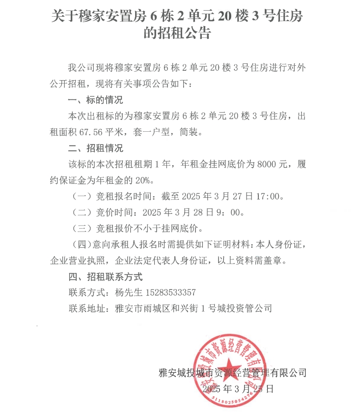 關(guān)于穆家安置房6棟2單元20樓3號住房的招租公告