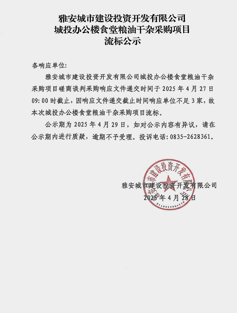雅安城市建設(shè)投資開發(fā)有限公司辦公樓食堂干雜采購項目流標公示