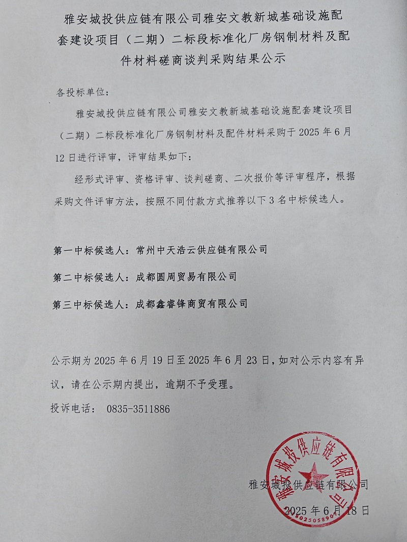 雅安城投供應(yīng)鏈有限公司雅安文教新城基礎(chǔ)設(shè)施配套建設(shè)項目(二期)二標段標準化廠房鋼制材料及配件材料磋商談判采購結(jié)果公示