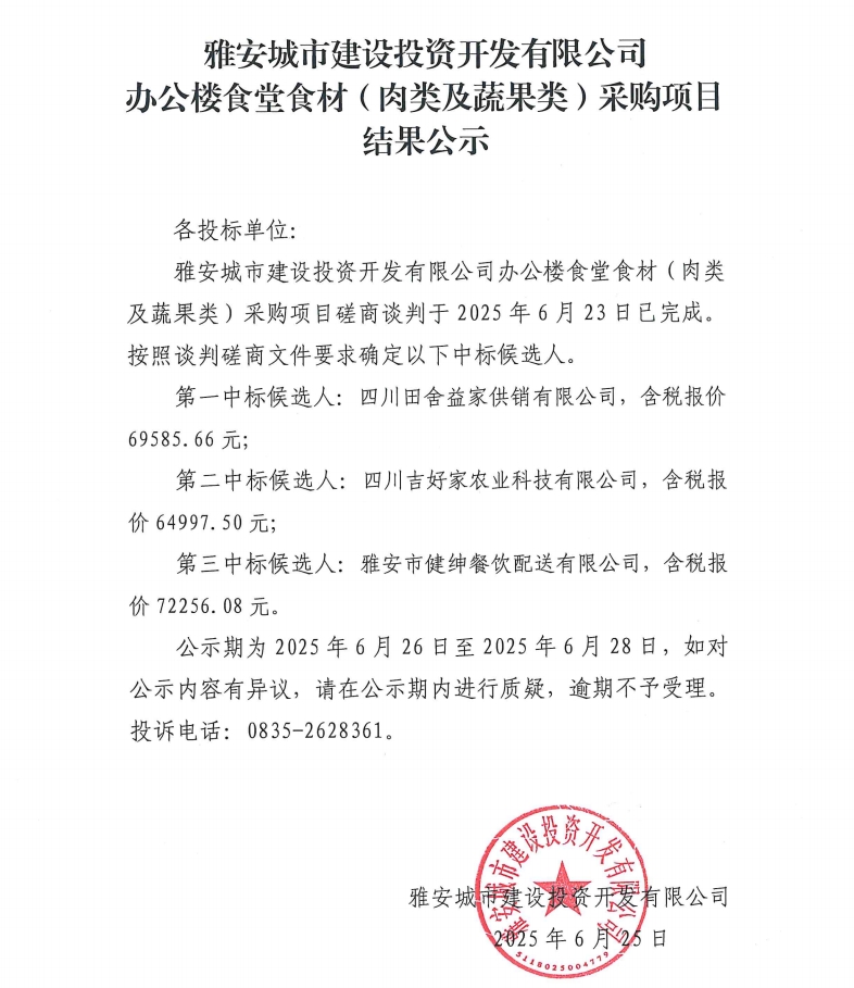 雅安城市建設(shè)投資開(kāi)發(fā)有限公司城投辦公樓食堂食材(肉類及蔬果類)采購(gòu)項(xiàng)目結(jié)果公示