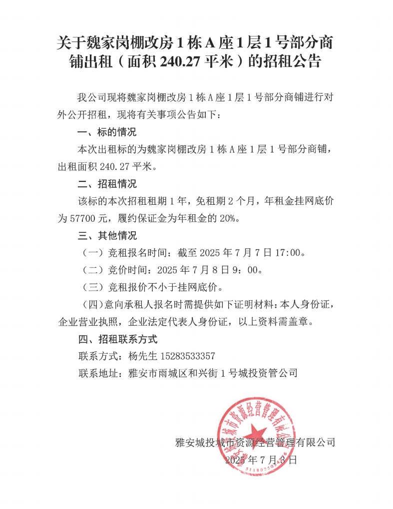 關(guān)于魏家崗棚改房1棟A座1層1號部分商鋪出租(面積240.27平米)的招租公告