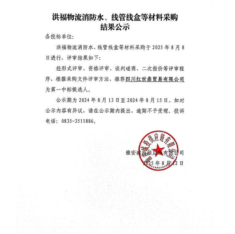 洪福物流消防水、線管線盒等材料采購(gòu)結(jié)果公示
