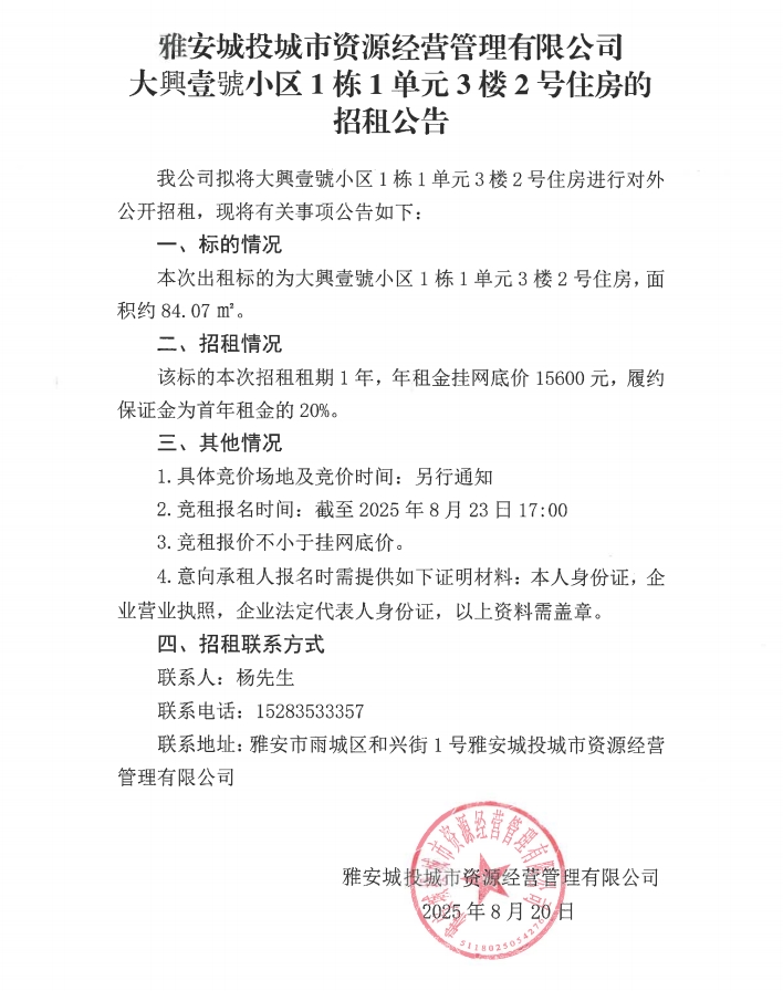雅安城投城市資源經(jīng)營管理有限公司大興壹號(hào)小區(qū)1棟1單元3樓2號(hào)住房的招租公告