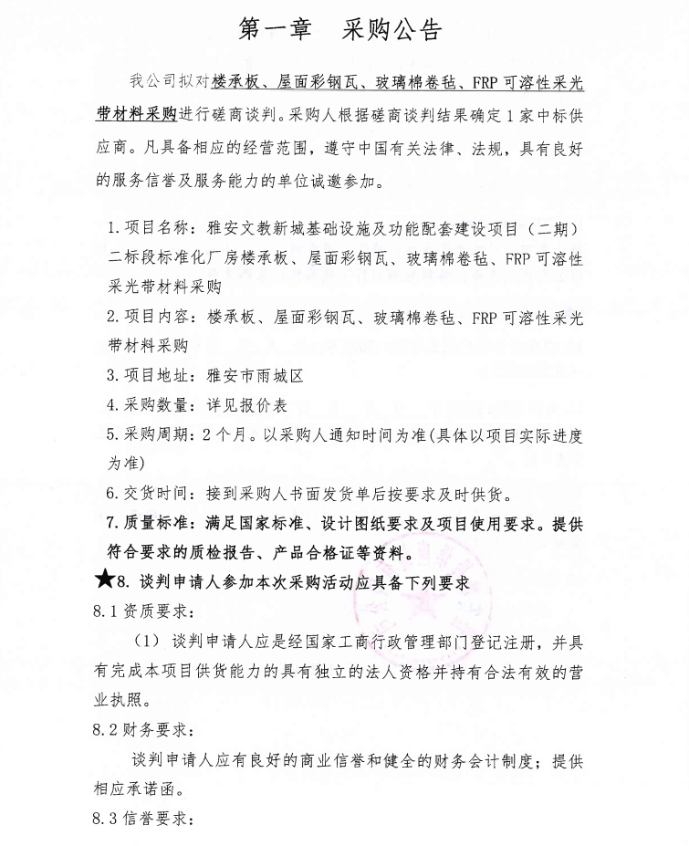 雅安文教新城基礎(chǔ)設(shè)施及功能配套建設(shè)項目(二期)二標段標準化廠房樓承板、屋面彩鋼瓦、玻璃棉卷氈、FRP可溶性采光帶材料采購公告