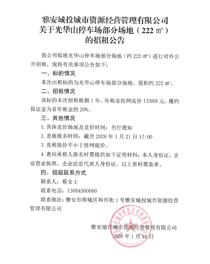 雅安城投城市資源經營管理有限公司關于光華山停車場部分場地(222㎡)的招租公告
