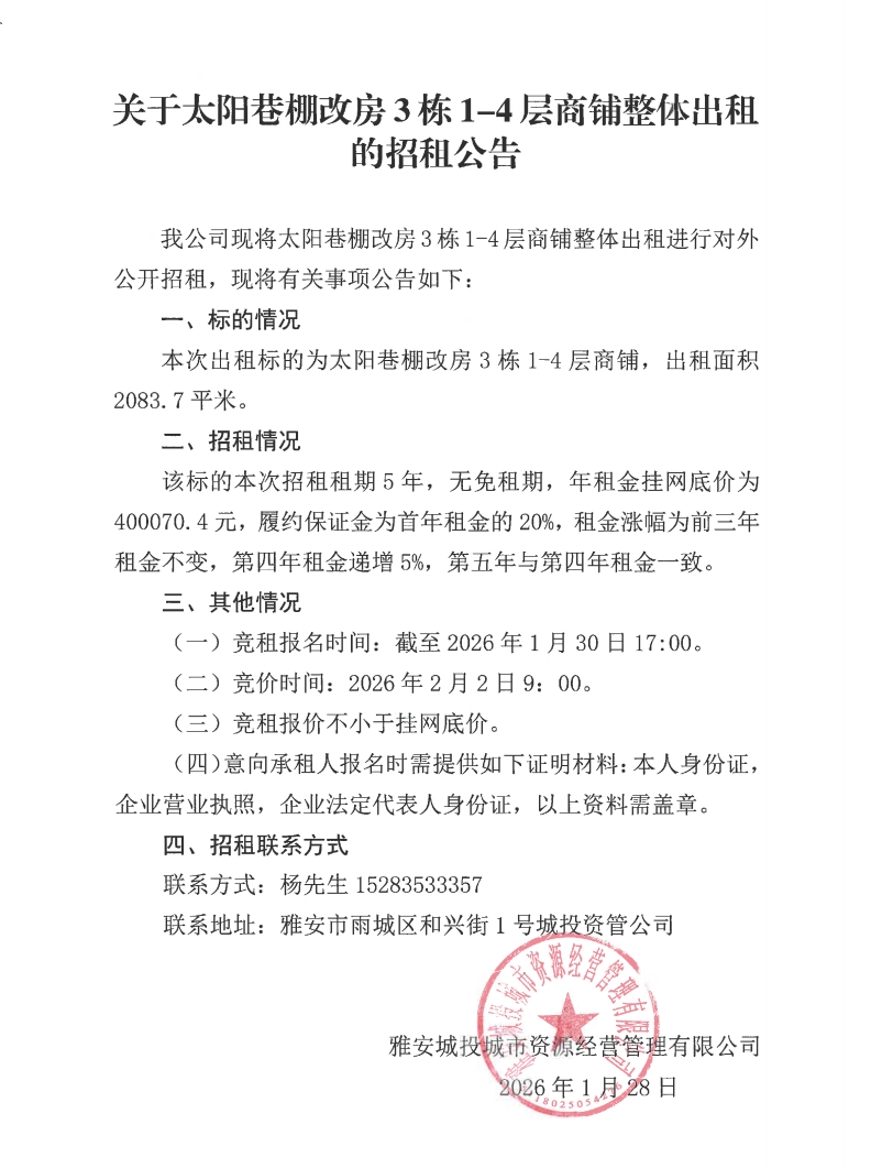 關(guān)于太陽巷棚改房3棟1-4層商鋪整體出租的招租公告
