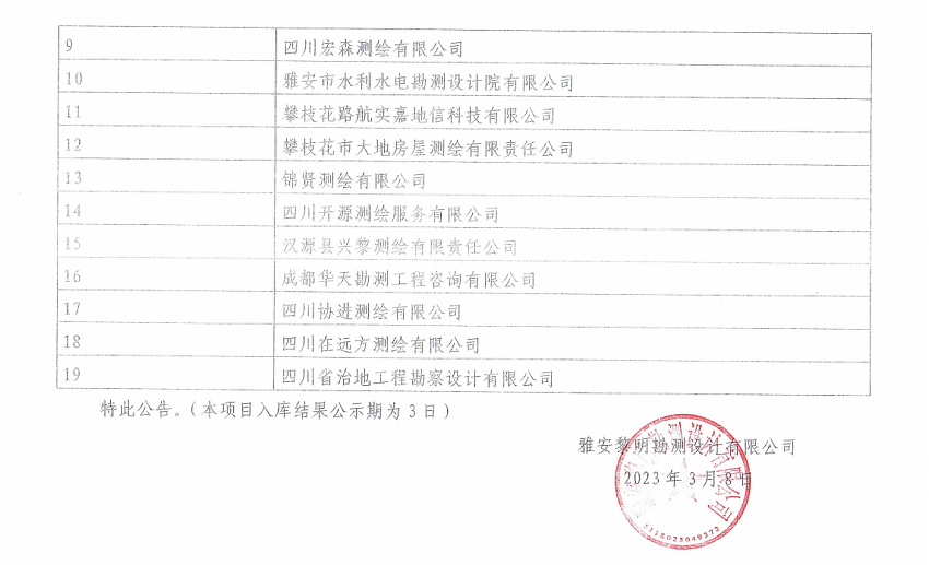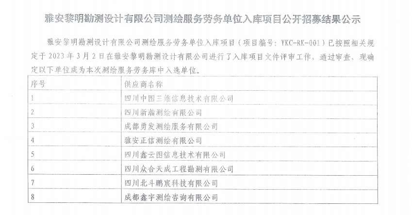雅安黎明勘測(cè)設(shè)計(jì)有限公司測(cè)繪服務(wù)勞務(wù)單位入庫項(xiàng)目公開招募結(jié)果公示