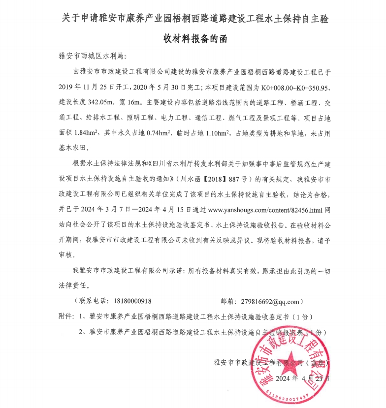 關(guān)于申請雅安市康養(yǎng)產(chǎn)業(yè)園梧桐西路道路建設(shè)工程水土保持自主驗(yàn)收材料報備的函